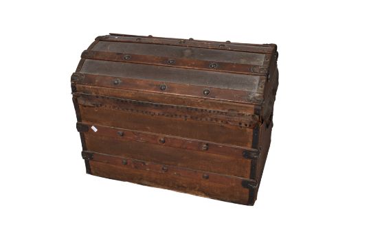 A vintage canvas and wood bound dome top travelling trunk. H58cm x W76cm x D52cm
