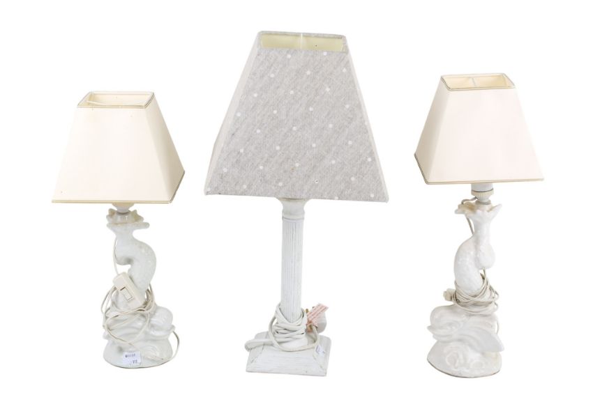 Three modern white table lamps. Including a pair of ceramic dolphins. Max. H27cm