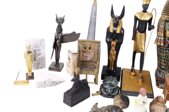 A quantity of assorted ancient Egyptian style decorative ornaments. Including deities, sarcophagus, etc. Max. H39cm