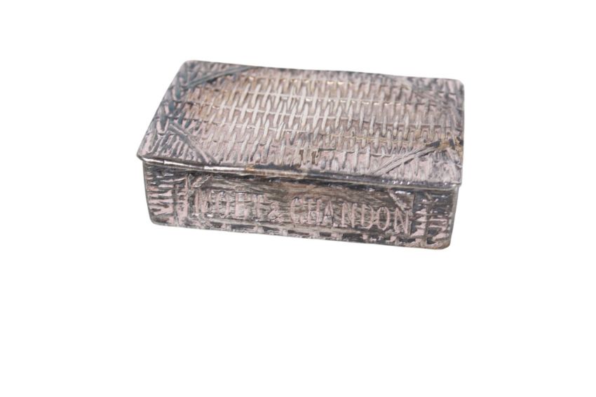 A white metal Moet et Chandon vesta case in the form of a picnic basket. Named across the front, unmarked, H1.2cm x W4.8cm x D3.4cm.