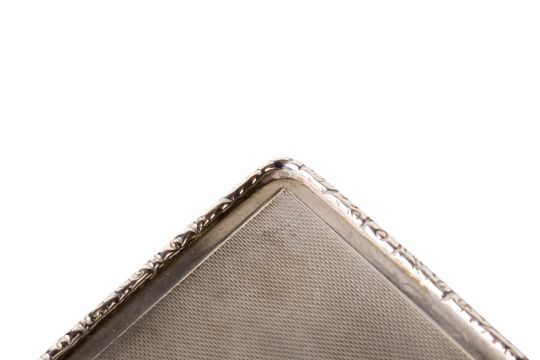 A George V silver cigarette case. Of rectangular form with moulded scrolling borders, the hinged lid with engine turned decoration and an engraved cartouche, having a gilt interior, hallmarked A Wilcox, Birmingham 1934, L8.5cm, weight 117.9g.