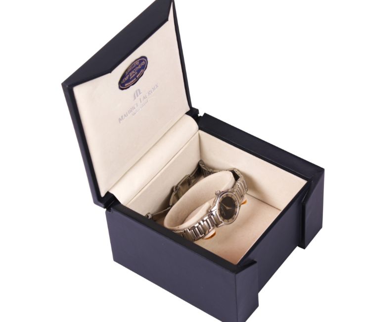 A lady's Maurice Lacroix wristwatch. The black dial surrounded by a stainless steel bezel with Roman numerals, in a stainless steel case with bracelet strap, dial diameter 2.5cm, in the original box with the outer case.