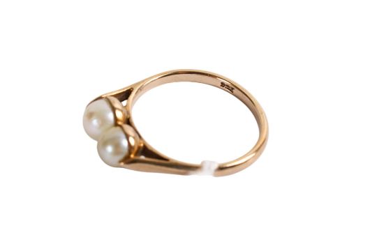 A 9ct gold (tested) double pearl ring. The largest pearl 5.7mm diameter, the smaller of a very pale creamy-grey colour, shank marked 9ct, size P, gross weight 2.4g.