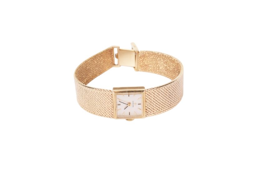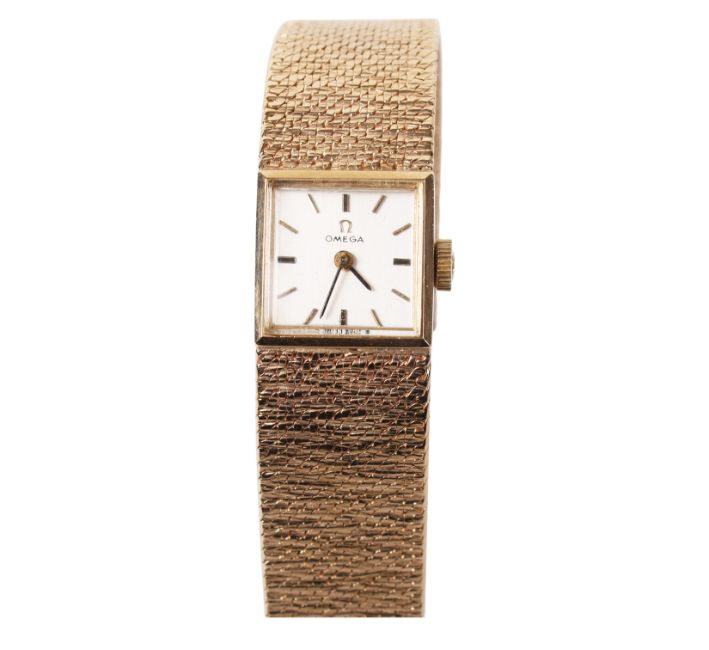 A lady's 9ct gold Omega wristwatch. The silvered dial with baton hour markers, in a 9ct gold case, manual movement, attached to a textured 9ct gold strap (loose clasp), case diameter 1.5cm, gross weight 33.9g.