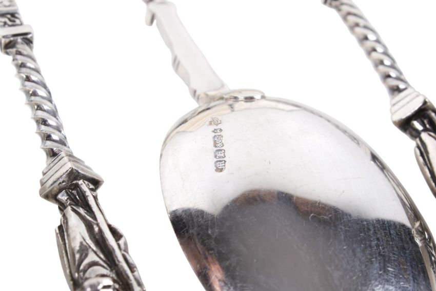 Two boxed sets of silver teaspoons, a set of white metal teaspoons and a set of silver plated spoons. Comprising a set of six teaspoons with tapered hexagonal handles, hallmarked H W Plate Manufacturing Co, London 1937, gross weight 64.4g, a set of eight teaspoons with oval handles, hallmarked Deakin & Francis Ltd, Birmingham 1913, gross weight 61.0g, the set of six white metal spoons having foliage stems and marked 'Italy' to the underside of the bowls, gross weight 93.8g, the set of six silver plated tablespoons having gilt bowls and twisted stems topped with models of Christ.