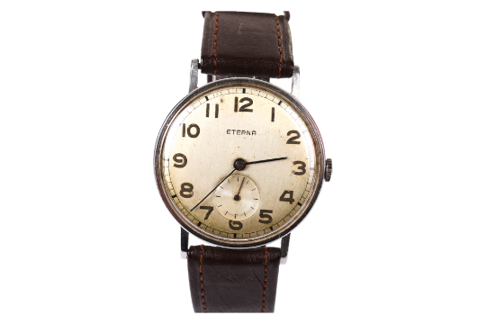 A gentleman's Eterna wristwatch. The silvered dial with Arabic numerals and a subsidiary seconds dial, in a stainless steel case marked '2833587', on a brown leather strap, dial diameter 3.2cm, in the original box. Condition Report: Winds fine, changes hands. Working at time of report. Age related discolouration to face, scratches to glass and face. PLEASE NOTE THIS IS NOT AN AUTOMATIC MOVEMENT.