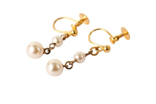 A pair of yellow metal and pearl drop earrings. Featuring two graduated pearls attached to a chain, with screw-back fittings, marked '9ct', drop 2.8cm.gross weight 1.5g.