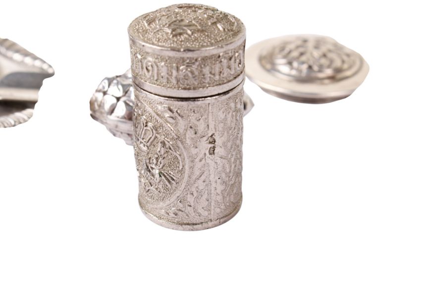 An assortment of 19th century and later silver and white metal. Comprising three shakers, including a silver Georgian example, the lid modelled as a flower, decorated with embossed leaves and mounted on a circular base, hallmarked Charles Fox, London 1810, 71.1g, H8cm, a cylindrical lidded pot, and a triangular ashtray with an embossed border. Gross weight 216g.
