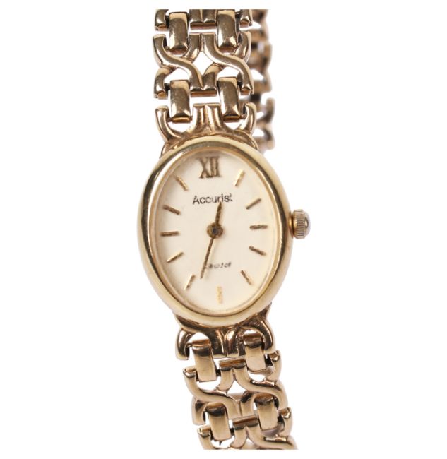 A lady's 9ct gold Accurist wristwatch. The oval case having a champagne dial with baton hour markers, in a probably 9ct gold case (unopened), attached to a hallmarked 9ct gold bracelet strap, case diameter 1.8cm x 1.5cm, gross weight 18.2g.