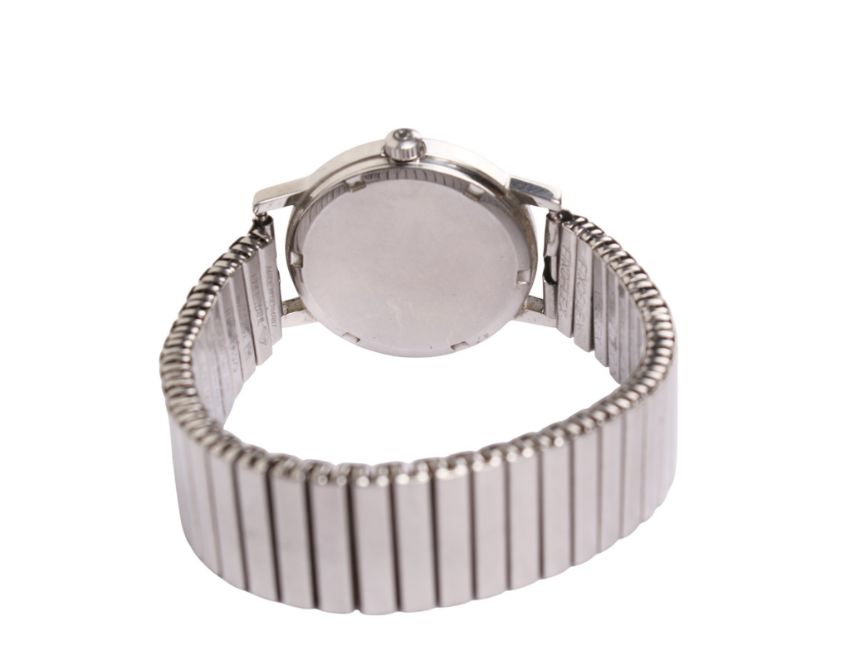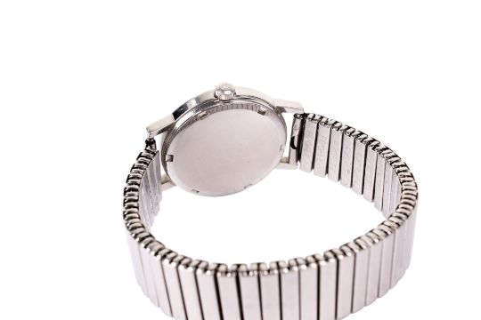 An Omega Genève gentleman's stainless steel wristwatch. With silver markers to the silvered face, date aperture, case unopened, diameter 3.4cm, on an elasticated bracelet strap.