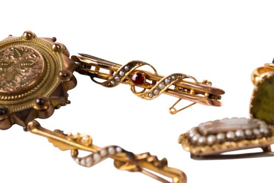 Six pieces of gold and gold plated 19th and 20th century jewellery. Including two bar brooches marked 9ct; a hallmarked Etruscan style round brooch; an unmarked mourning brooch; a mourning pendant; and a green stone seal fob engraved 'The best gift of love'. The two bar brooches weighing 4g, total gross weight 24.9g.