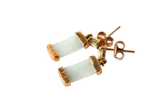 A pair of 9ct gold, jade and peridot earrings. The posts hallmarked, the lower band marked 375, total drop 2cm, gross weight 2.4g.