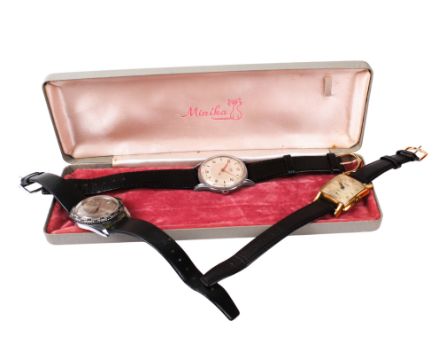 Three gentleman's wristwatches. Comprising a Romar, the dial having Arabic and baton hour markers, in a gilt and stainless steel case, attached to a black leather strap, case diameter 2.6cm, a Sicura 'All Times' waterproof watch, the silvered dial with Arabic numerals and baton hour markers with a date aperture and black bezel, in a stainless steel case, attached to a black leather strap, case diameter 3.6cm, and an Enicar with Arabic numerals and baton hour markers, in a stainless steel case, attached to a black leather strap, case diameter 3.6cm.