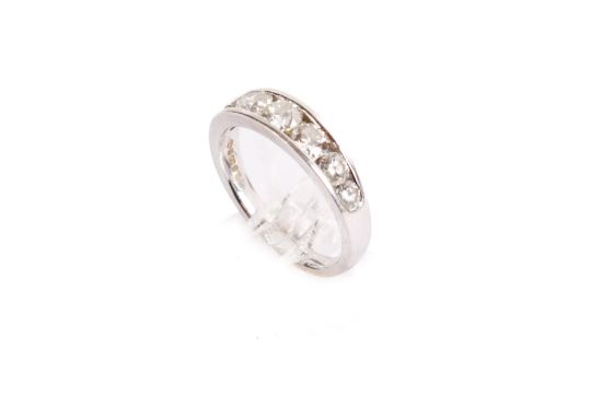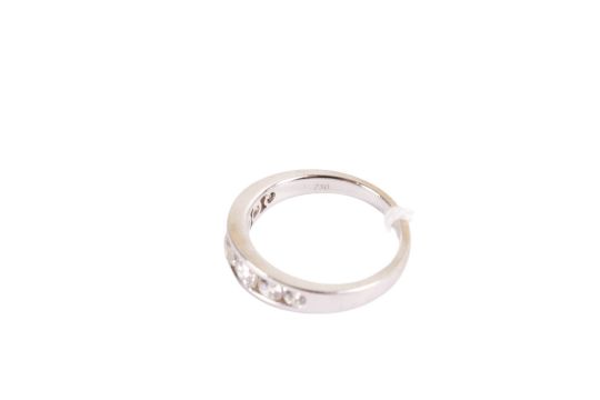 An 18ct white gold and diamond ring. Set with seven graduated round cut diamonds, the largest circa 0.34ct estimated weight, hallmarked, size M, gross weight 3.7g.