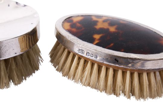 An assortment of silver backed dressing table accessories. Comprising a mirror hallmarked W J Myatt & Co, Birmingham 1912, two silver and faux tortoiseshell brushes and three silver backed brushes.
