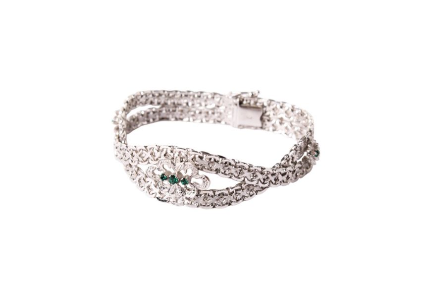 A white metal filigree bracelet. The crossover detailed pattern set with small green paste stones, marked 800 to clasp, L18cm, gross weight 22.8g.