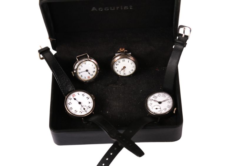 Four silver cased watches. Comprising a pocket watch, the white enamel dial with Arabic numerals, diameter 2.9cm, a lady's watch with a white enamel dial and Roman numerals, diameter 2.6cm, a trench watch, the white enamel dial with Arabic numerals, with a black leather strap, diameter 3.2cm, and a trench watch, the white enamel dial with Arabic numerals and a subsidiary seconds dial, on a black leather strap, 3.5cm.