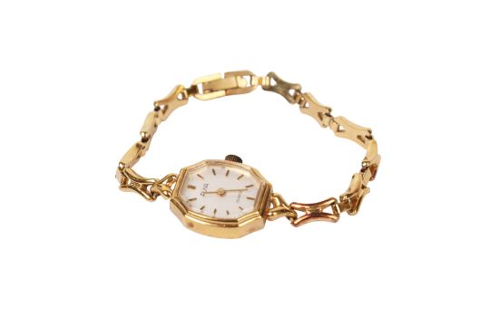 A lady's yellow metal Aviva wristwatch. The silvered dial with baton hour markers, in a yellow metal case, quartz movement, attached to a yellow metal bracelet strap, case diameter 1.5cm, gross weight 11.3g.