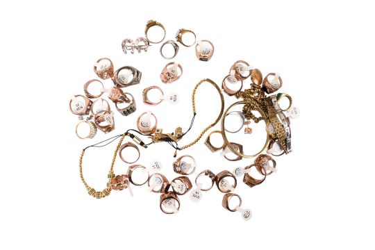 An assortment of costume jewellery. Including signet rings, a lady's Seiko watch, gold plated curb chain, a silver horseshoe brooch, a necklace marked 'S925', a hinged bangle and more.