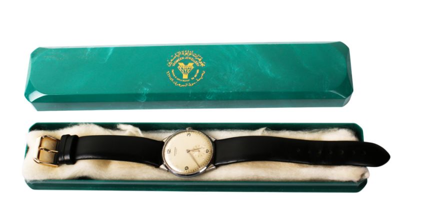A gentleman's Universal Geneve wristwatch. The dial having Arabic numerals and a subsidiary seconds dial, in a stainless steel case marked '1126123 31223', manual movement, on a black leather strap, case diameter 3.5cm.