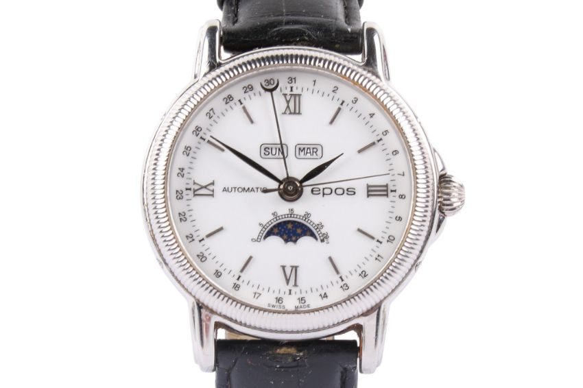 Epos Emotion 'moon phase' stainless steel wristwatch, boxed. White dial, Roman numerals and batons, day/date/moon aperture, no. 3191 with black leather strap, circa 2001, case diameter 37mm