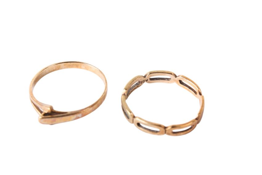 Two 9ct gold rings. One with pierced oval pattern, both hallmarked, misshapen sizes circa M/N, gross weight 2.7g.