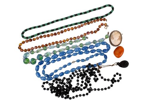 A small group of costume jewellery. Comprising a butterscotch amber brooch circa 3.3cm x 2.5cm, a gold plated and faux pearl mounted cameo, five glass and other bead necklaces in blue, green, black and brown, and a carved jet pendant.