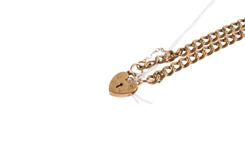 A 9ct gold double flat link chain bracelet. Hallmarked to end link, with yellow metal heart shaped lock stamped 375, L18cm, gross weight 5.7cm