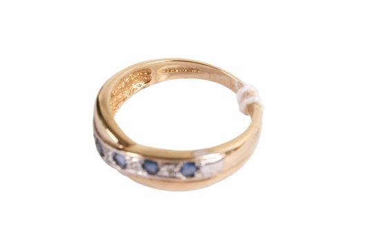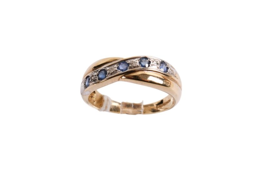 A 9ct gold and sapphire ring. The five small round cut stones in a bi-colour crossover setting, hallmarked, size N/O, gross weight 3.2g.