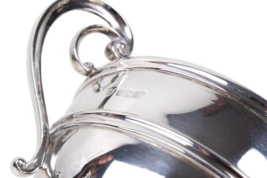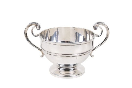An early 20th century silver twin handled cup. With double scroll handles, horizontal ribbing to the body, over a spread, short foot. Hallmarks for James Deakin & Sons, Sheffield 1909, H11cm x W17.5cm, weight 292.3g.