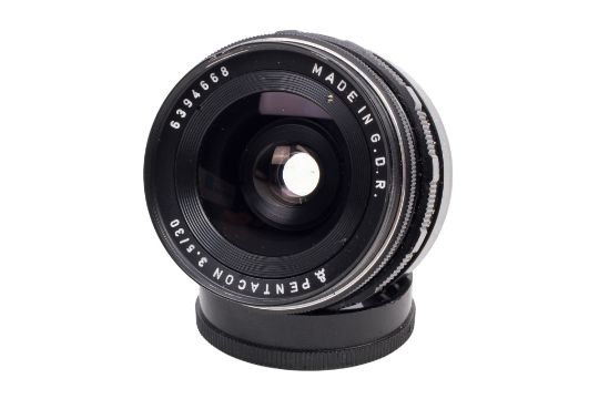 Three Pentacon G.D.R M42 mount lenses. To include; a 30mm f3.5, optics G, functions well; a 100mm f2.8, optics F, oil on iris blades; and a 300mm f4, optics VG/E, functions well (boxed).