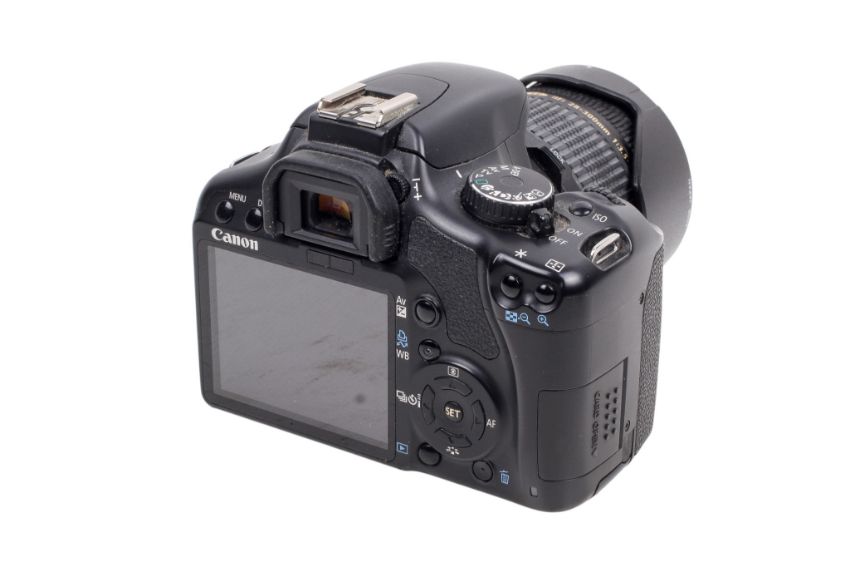 A Canon EOS 450D Digital SLR camera. Powers on, shutter working. With a Tamron AF Aspherical 28-300mm f3.5-6.3 Macro lens, optics G/VG, 2x Teleplus MC7 teleconverter, battery, charger, strap and case.