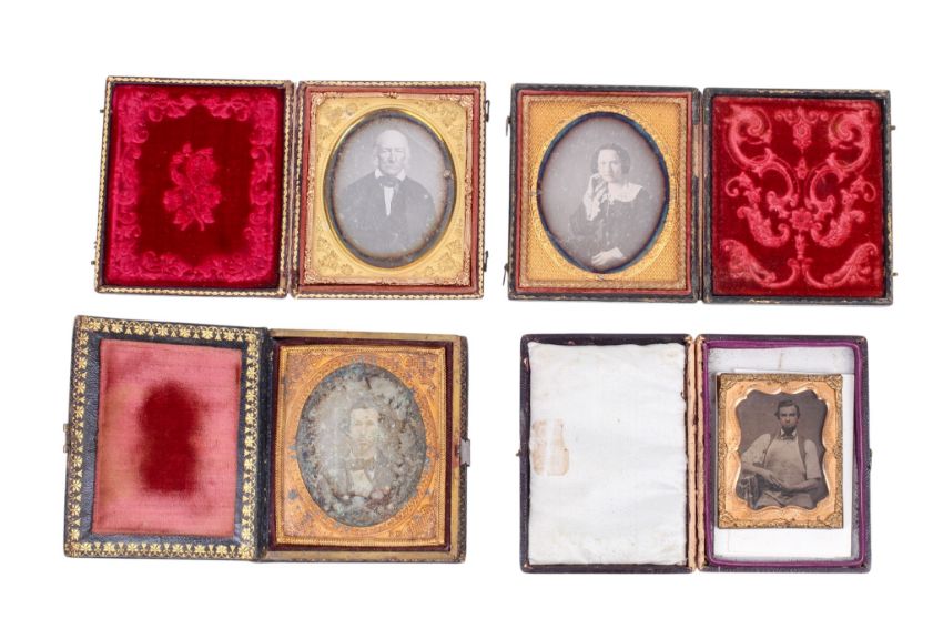 A group of four cased Victorian photographs. To include three Daguerreotype portraits and an Ambrotype portrait. Max. 5.5cm x 7cm, framed and glazed, 8cm x 9.5cm