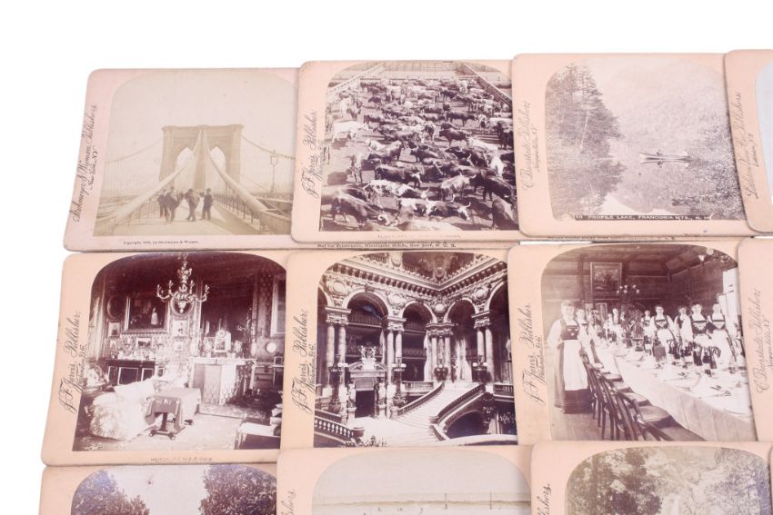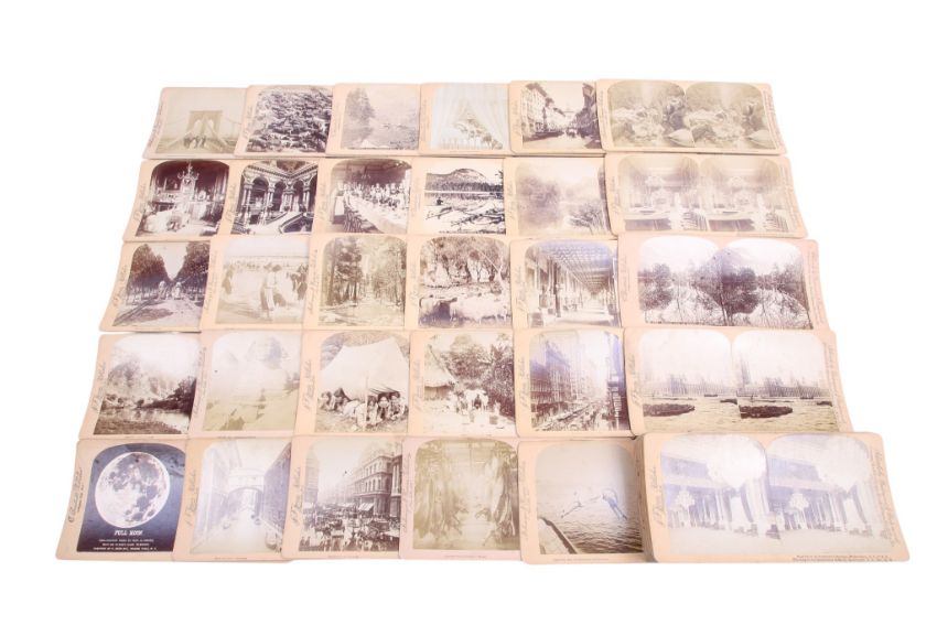 A stereoscopic viewer and a collection of viewing cards. To include approximately 50 views from publishers such as Littleton View Co, J. F. Jarvis, Strohmeyer & Wyman, and Charles Bierstradt. All retailed by Underwood & Underwood.The viewer missing handle and card holder (AF)