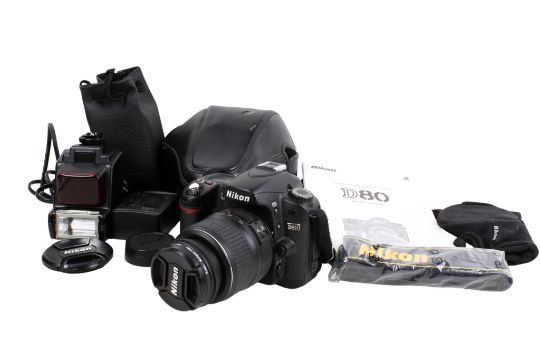 Nikon D80 digital SLR camera with a Nikkor AF-S DX 18-55mm lens, etc. Body s/n 8010766, lens s/n 2909267, Nikon EN-EL3e Li-ion battery and charger, a Nikon Speedlight SB-22s flash s/n 3000608, camera instruction booklet, etc.