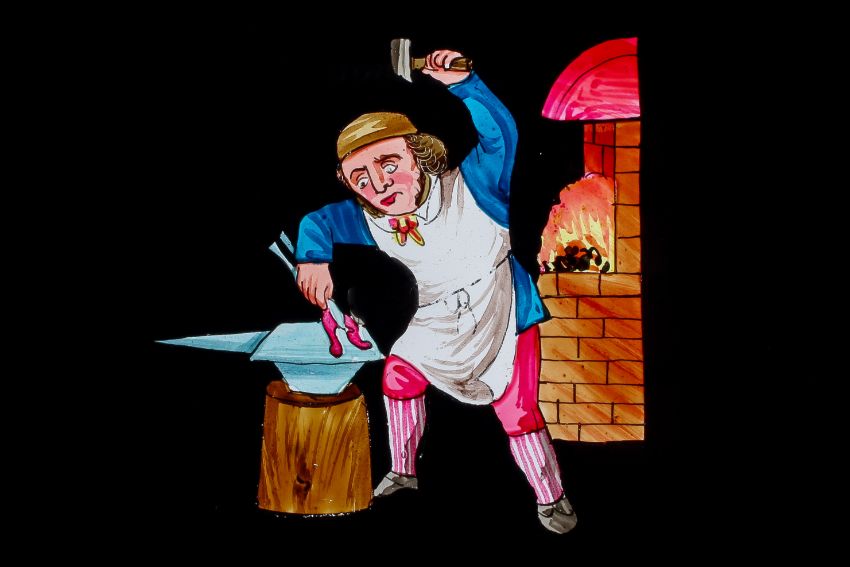 A collection of wood-framed hand-coloured single-slipper animated moving Magic Lantern Slides. Some stamped 'Newton', most unbranded. Examples include a skeleton lifting off their skull, a photographer talking to his subject through the lens, a cricketer getting hit in the face by the ball, a bull butting a lamb, and more. (31)