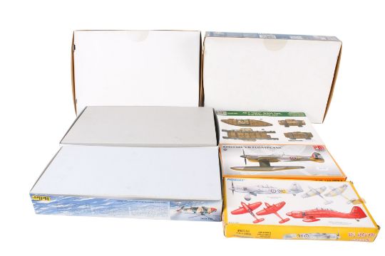 A collection of military plastic model kits. Including a Tamiya 1:48 scale Royal Navy Sea Harrier FRS.1, an Italeri 1:72 scale Waco CG-4A, a Heller 1:72 scale Sea King no.80334 and more. All in the original boxes.