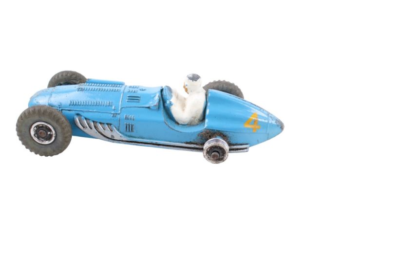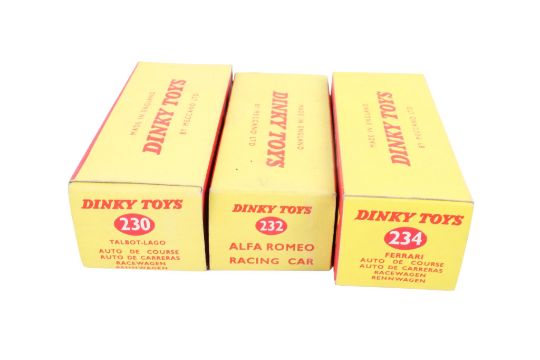 Three Dinky diecast racing cars. Comprising a No.230 Talbot-Lago Racing Car, blue body and racing No. 4, with white driver figure, a No.232 Alfa Romeo Racing Car, red body and racing No. 8, with white driver figure, and a No.234 Ferrari Racing Car, blue and yellow body and racing No. 5, yellow hubs, with white driver figure. All in boxes with no pictures.