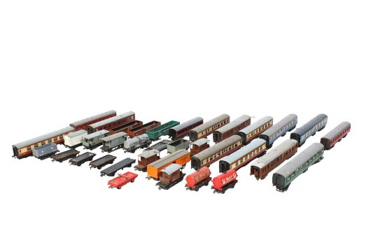 A collection of 00 gauge carriages. Including a set of Hornby Dublo tinplate carriages in red and cream livery M26133, a Tri-ang Buffet Car, Pullmans carriages and more.