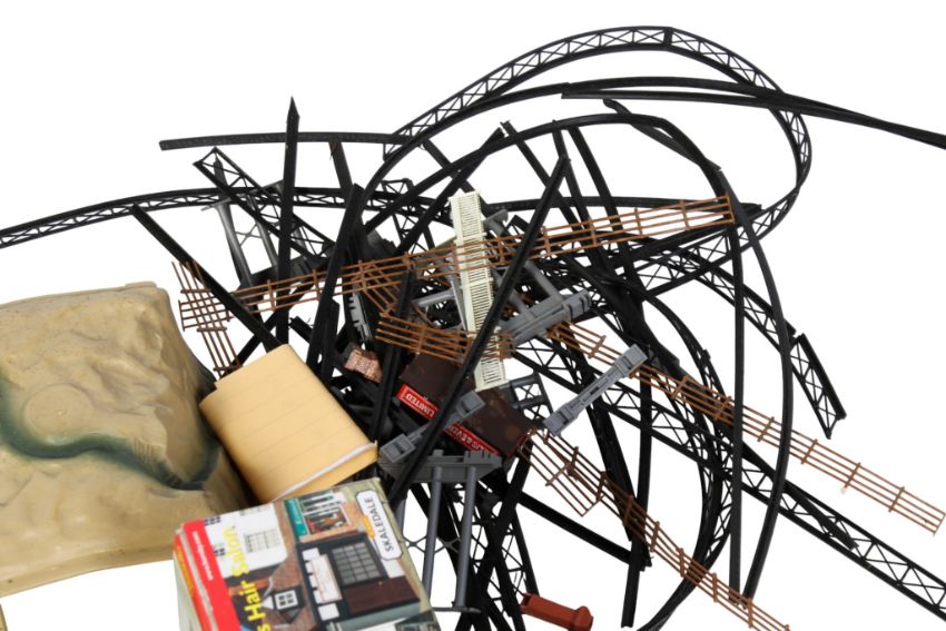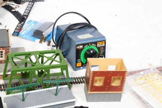 An assortment of 00 gauge layout accessories. Including a boxed Hornby Railways R504 Engine Shed, a boxed Hornby R418 Dunster Station kit, lengths of track and a turntable, constructed buildings, figures, power units and more.