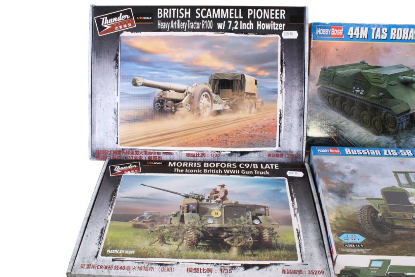 Four 1:35 scale military vehicle model kits. Comprising a Hobby Boss No.83886 Russian ZIS-5B Truck, a Hobby Boss No.83898 44M TAS Rohamloveg, a Thunder Model No.35209 Morris Bofors C9/B LATE and a Thunder Model No.35212 British Scammell Pioneer, all in the original boxes.