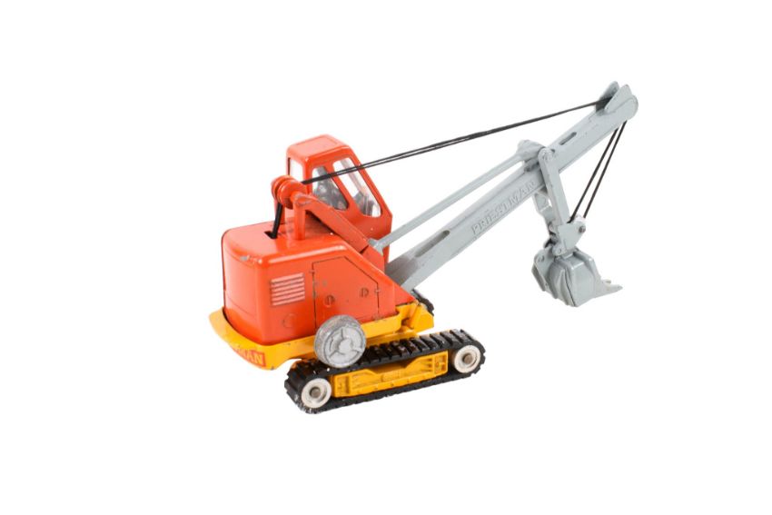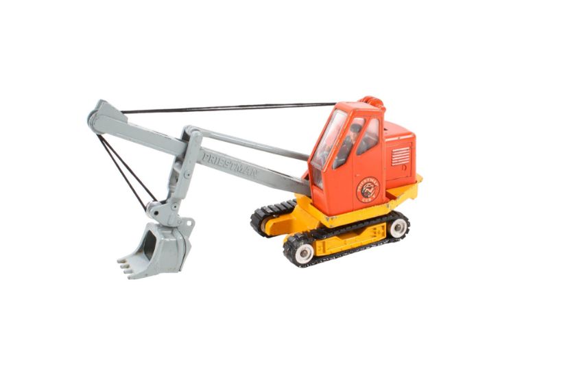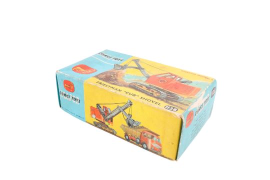 A Corgi Major No.1128 Priestman 'Cub' Shovel. Orange cab with yellow base, chrome rollers with black rubber tracks, grey jib and shovel, in the original box with a blue and yellow carded lift off picture lid.