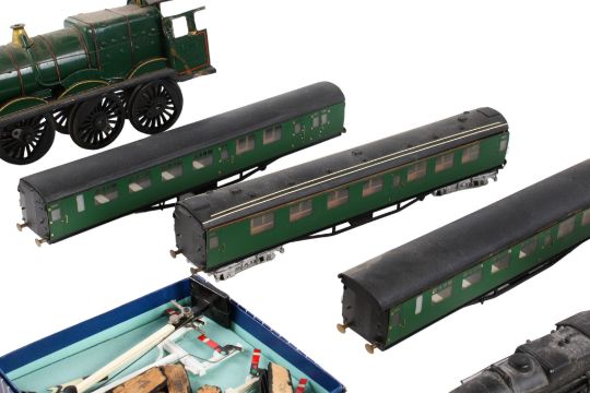 An assortment of altered and amended electric locomotives and tenders. Of various gauges, including clockwork and electric examples, a Hornby Dublo boxed D3 Junction Signal set, partially assembled carriages and more.