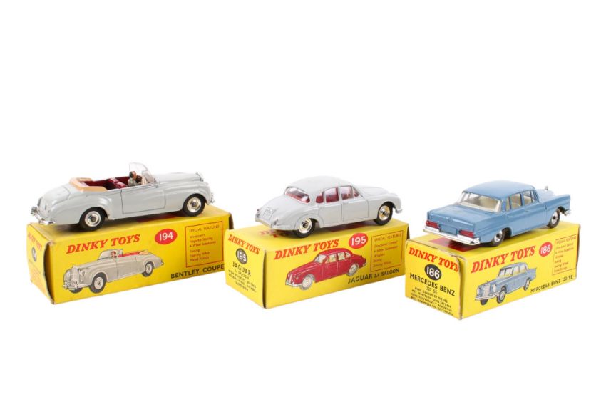 Three Dinky diecast cars. Comprising a No.186 Mercedes Benz 220SE, RAF blue body with off-white interior, No.194 Bentley Coupe, grey body with maroon interior, beige hood, chrome hubs and a No.195 Jaguar 3.4 Saloon, grey body and red interior. All in the original boxes.