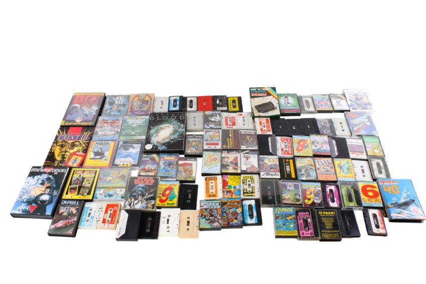 A large collection of computer game cassettes. Including 'William Wobbler', 'Captain Pytron', '10 Pack' and more. Some in the original cases.