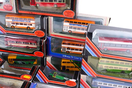 A collection of EFE 1:76 scale diecast buses and coaches. Including a No.15104 Leyland National Long 2 Door Bus 'Bristol City', No.20602 Plaxton Pointer Dennis Dart 'Badgerline', No.20432 Bristol VRIII 'Devon General' and more. All in the original boxes.
