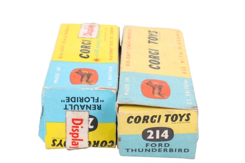 Two Corgi diecast cars. Comprising a No.222 Renault Floride, light green body, red interior, silver trim and flat spun hubs and a No.214 Ford Thunderbird in light green body with cream roof. Both in the original boxes.