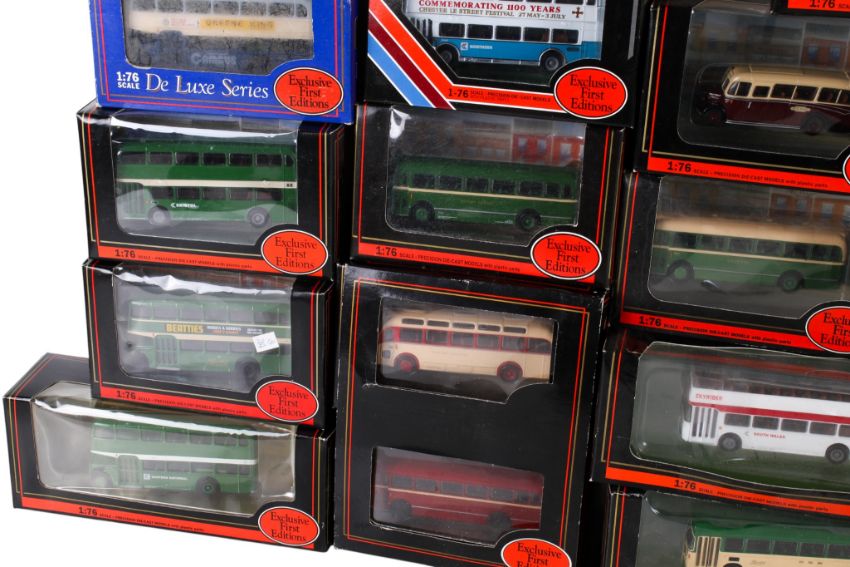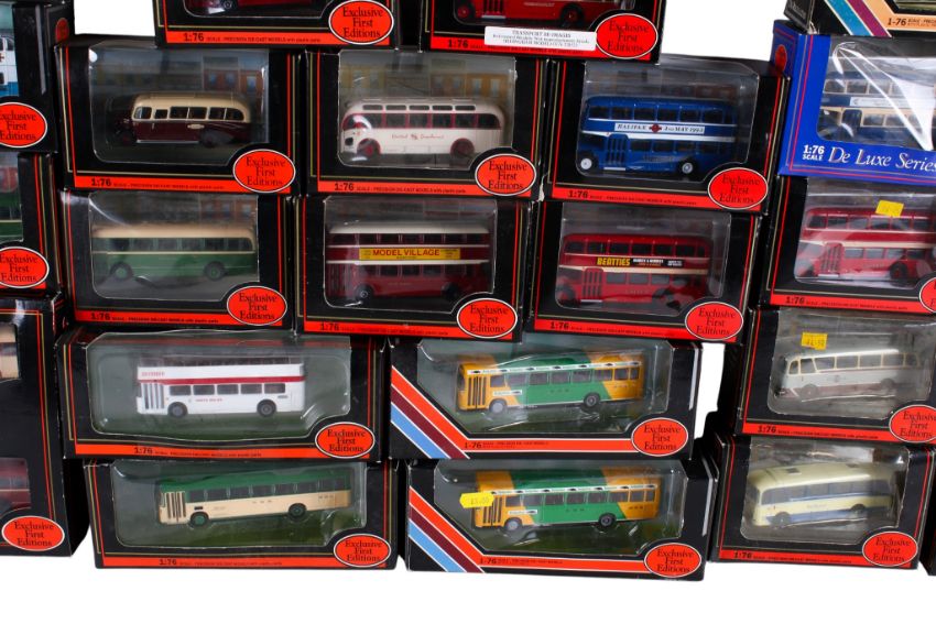 A collection of EFE 1:76 scale diecast model coaches and buses. Including a Bristol Lodekka 'Eastern National', No.14002, a Grey Cars Harrington Grenadier, No.12302, 'United Bristol' Lodekka Bus, No.14101 and more. All in the original boxes.