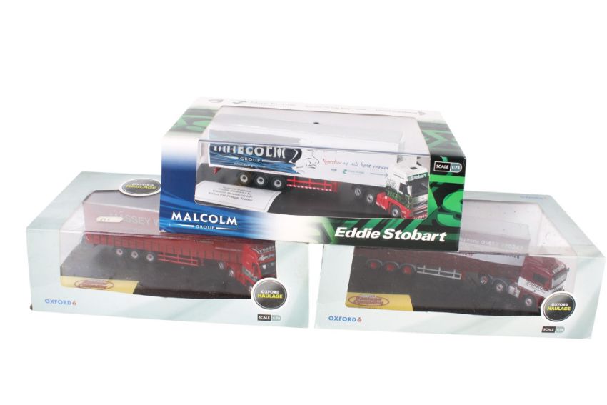 Five Oxford 1:76 scale diecast haulage vehicles. Comprising a Special Edition Eddie Stobart Ltd 'Cancer Research UK' Volvo FH Fridge Trailer, a Massey Wilcox VOL03CS No.1070/2000, two Downtown MAN03CS, No.1376/2000 and No.1067/2000 and a Kinlochbervie DAF02FR, No.0275/2000. All in the original boxes.