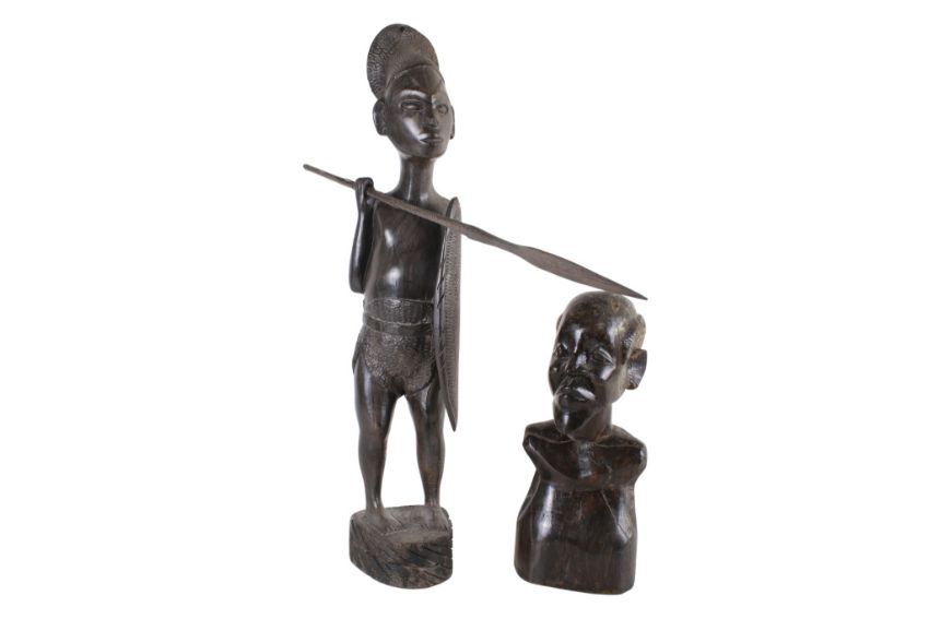 Two Angolian wooden tribal figures. Circa 1950s, one modelled as a warrior holding a spear, the other a bust of an elderly man, Max. H55cm.